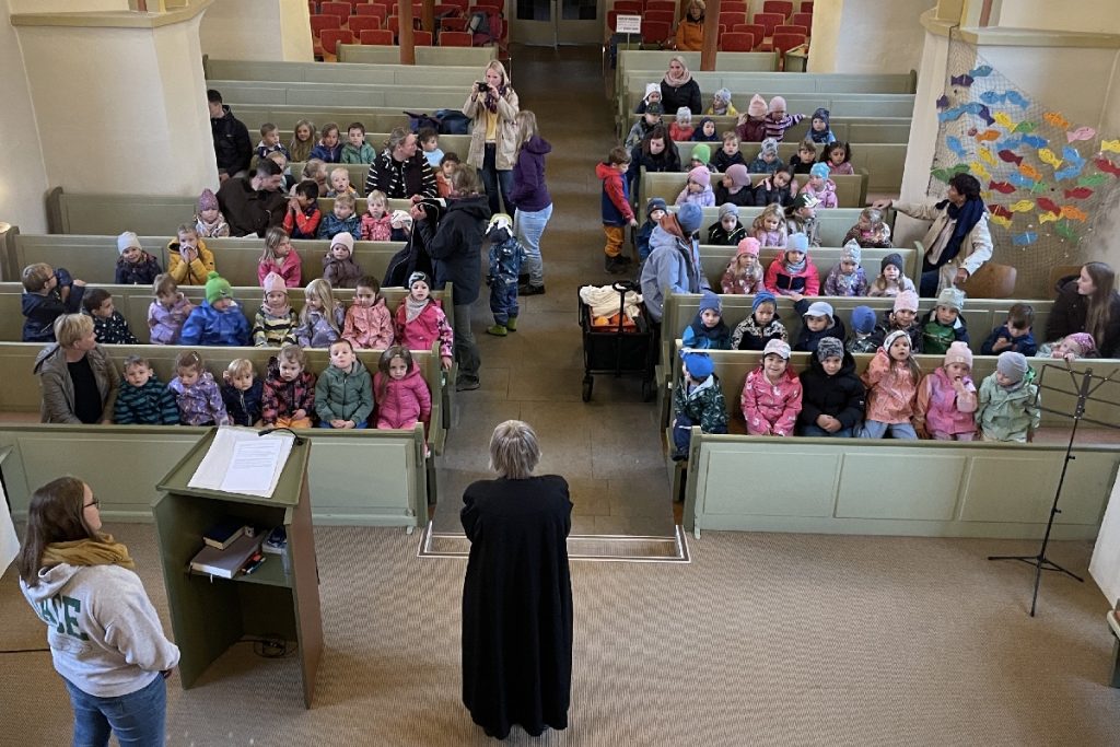 Am Montag, den 06.10.2025 machten sich 80 Kinder und ihre Erzieher*innen auf den Weg in die Kirche. Dort fand ein Erntedankgottesdienst statt, welcher von der Pastorin Frau Schönfelder und der Diakonin Frau Wusowski vorbereitet und durchgeführt wurde.