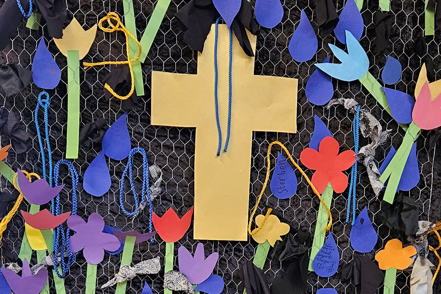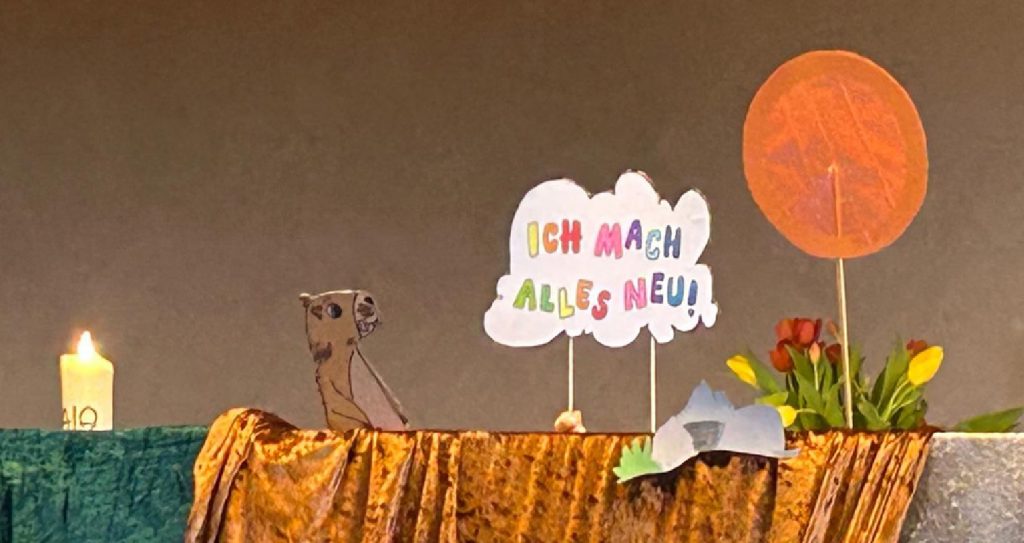Die Kinder haben sich hineinnehmen lassen in die Ereignisse der Karwoche und der Ostertage: Mit Angsttüchern, Fesseln und Tränen spürten wir den Gefühlen Jesu nach und erlebten die Freude der Auferstehung und der Hoffnung mit blühenden, bunten Blumen und Kerzenlicht.
