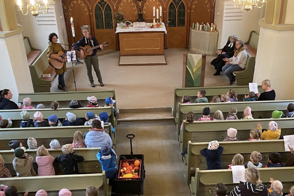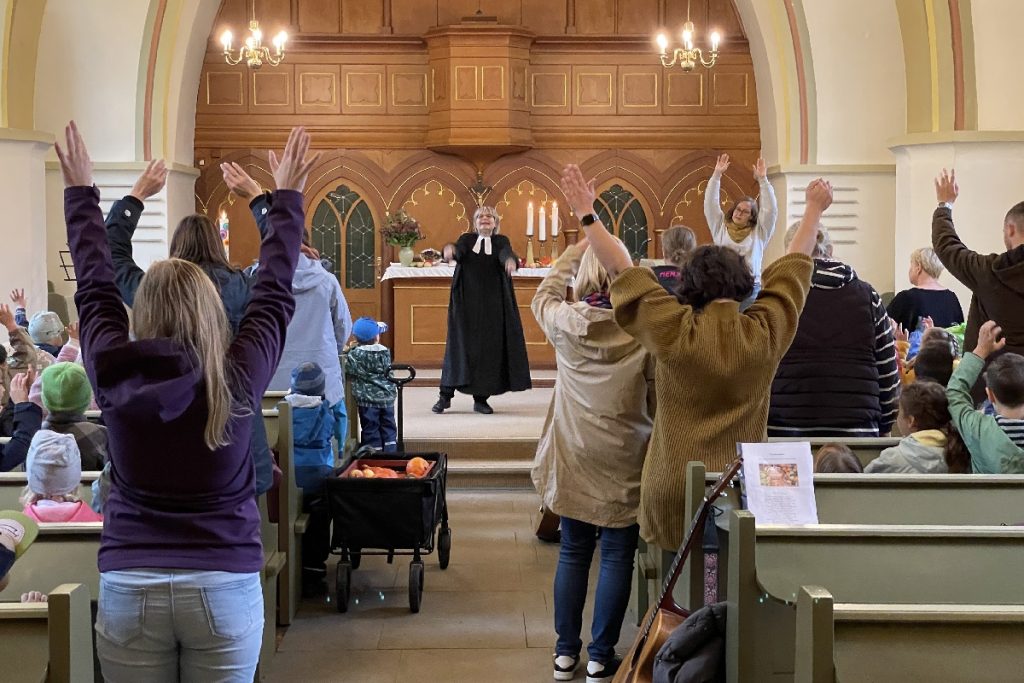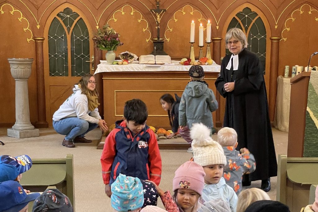 Am Montag, den 06.10.2025 machten sich 80 Kinder und ihre Erzieher*innen auf den Weg in die Kirche. Dort fand ein Erntedankgottesdienst statt, welcher von der Pastorin Frau Schönfelder und der Diakonin Frau Wusowski vorbereitet und durchgeführt wurde.