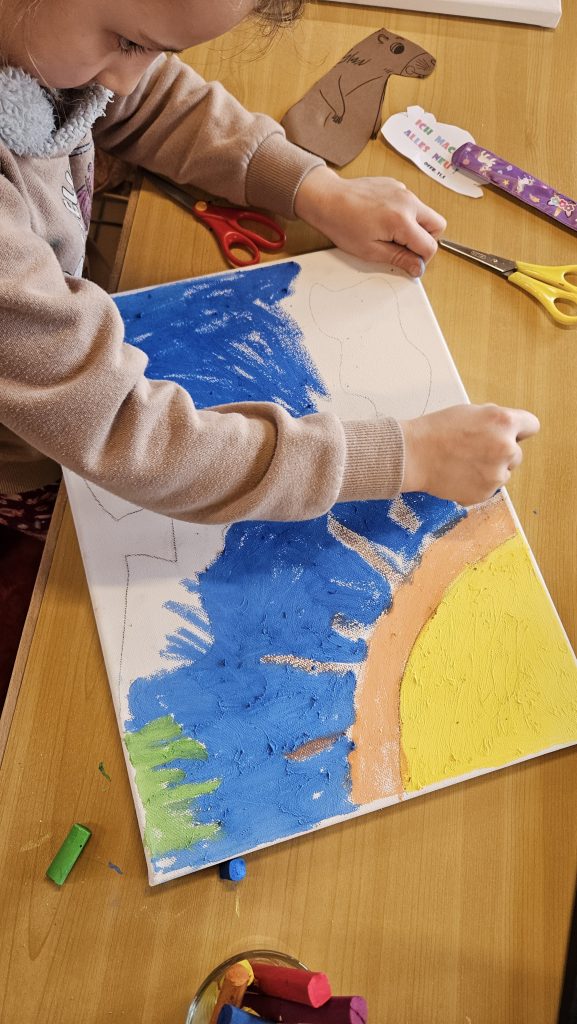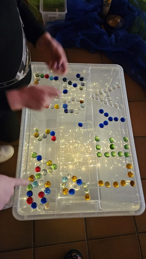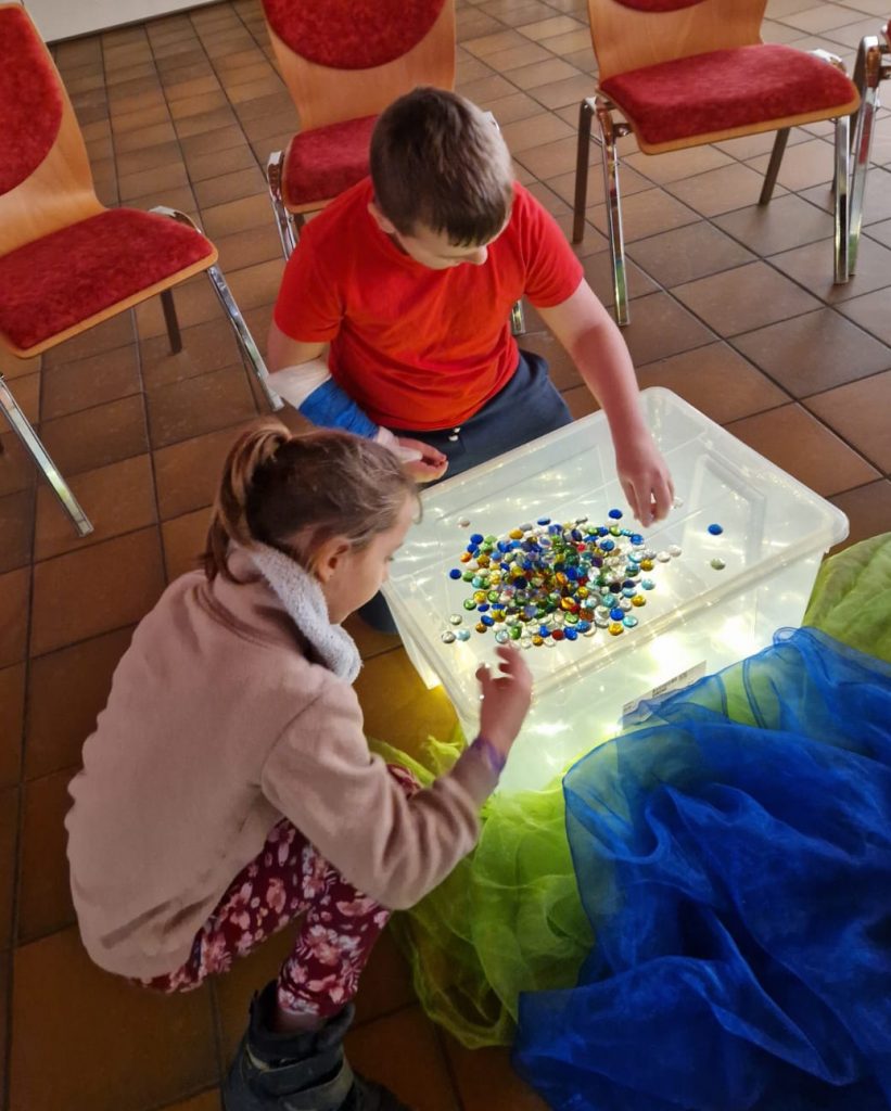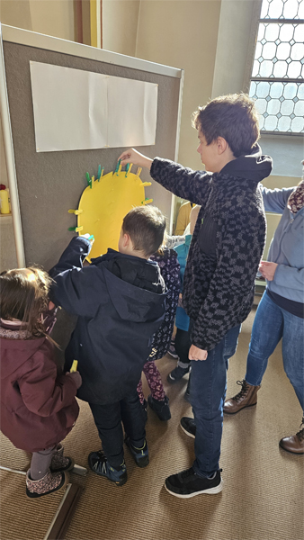 Zusammen mit den Kindern und dem Murmeltierjungen Magnus haben wir uns überlegt, was das heißt: An jedem Abend, wenn die Sonne untergeht endet ein Tag. Die Sonne ist weg. Es ist dunkel, wird kälter und man denkt, alles ist vorbei. Das kann Angst machen und ist natürlich auch auf andere Situationen in unserem Leben übertragbar. Am nächsten Morgen aber kommt die Sonne mit ihren wärmenden und hellen Strahlen wieder. Das gibt Mut und neue Kraft! Im Gottesdienst hatten wir lauter „Sonnenstrahlen“ in der Kirche versteckt, die von Kindern und Erwachsenen gesucht und mit Mut machenden-Worten beschriftet wurden. Denn manchmal muss man sich bewusst auf die Suche nach solchen Momenten machen!